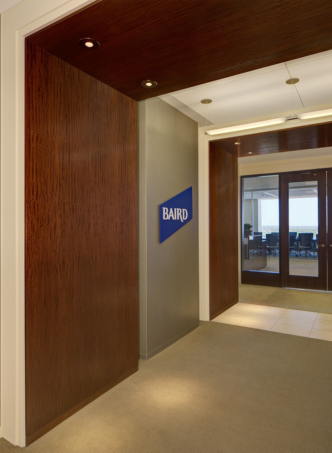 Robert W. Baird is an employee owned financial offive in Milwaukee, WI. This office highlighted unique woods that are both classic and are becoming popular again. Quartered cut wood highlighted the grain in the Mahogany and the Walnut in ways that the finish magnified. The other various materials that were used on the job showed that a varied portfolio of material goes together well.